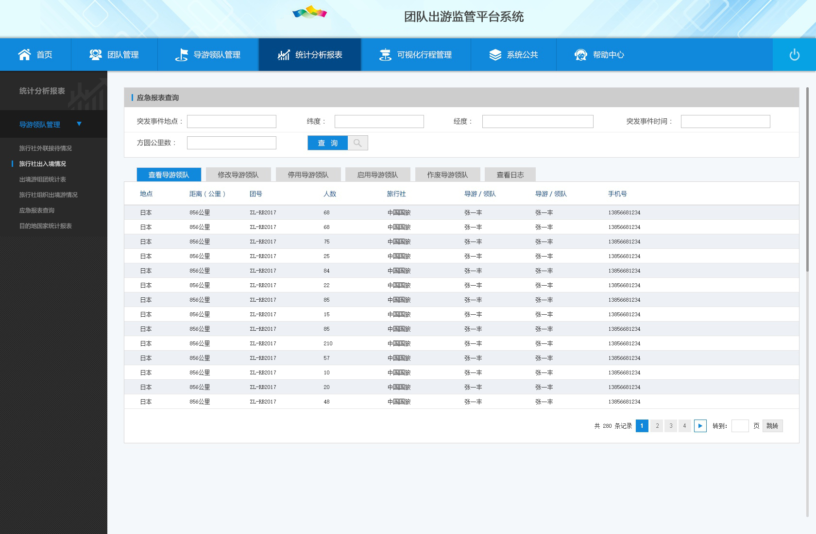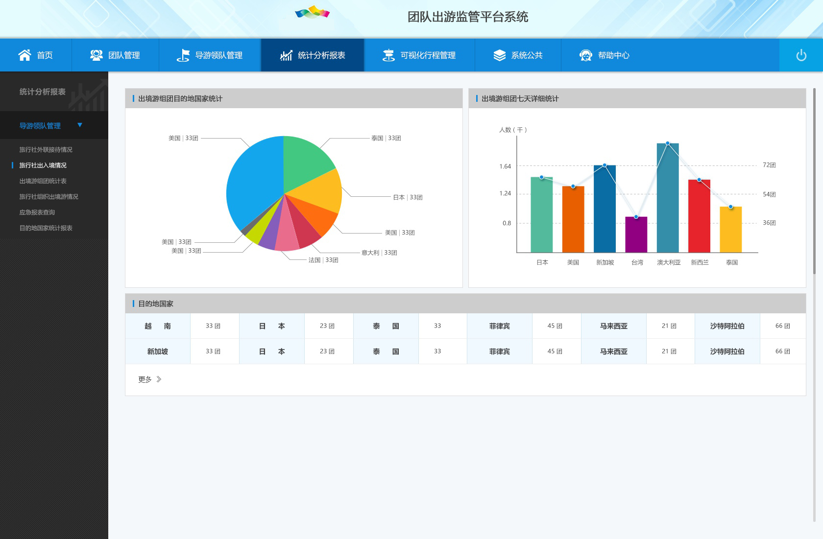 3) 統(tǒng)計分析報表:目的地國家統(tǒng)計表、應(yīng)急報表查詢、旅行社外聯(lián)接待情況、旅行社出入境情況、出境游組團統(tǒng)計表。