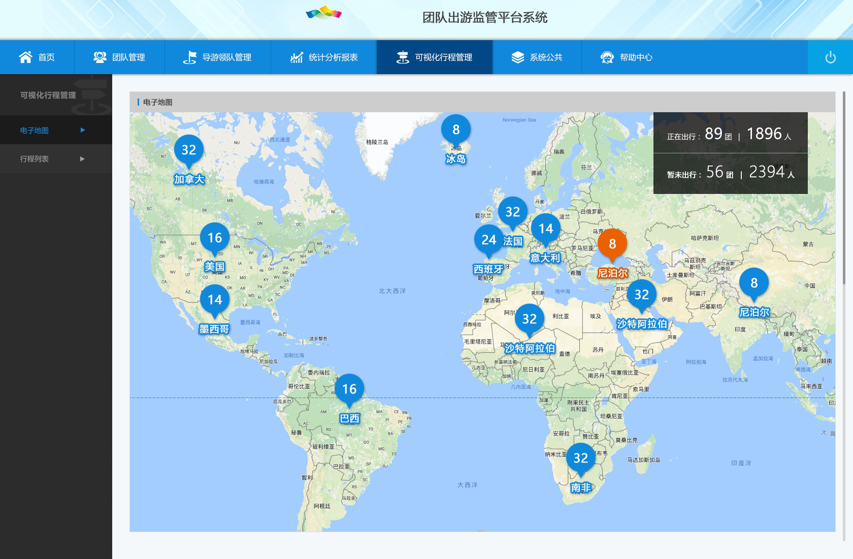 隨著出境旅游門檻越來越低,出境游熱度持續(xù)升溫,對出境旅游團隊進行有效管控就顯得至關(guān)重要,出境旅游團隊監(jiān)測與分析系統(tǒng)對接國家旅游團隊管理系統(tǒng)數(shù)據(jù),通過對旅游團電子行程單和旅游合同數(shù)據(jù)的接入,實現(xiàn)對出境旅游團隊監(jiān)測,方便在發(fā)生旅游突發(fā)事件時迅速開展救援、服務(wù)工作。