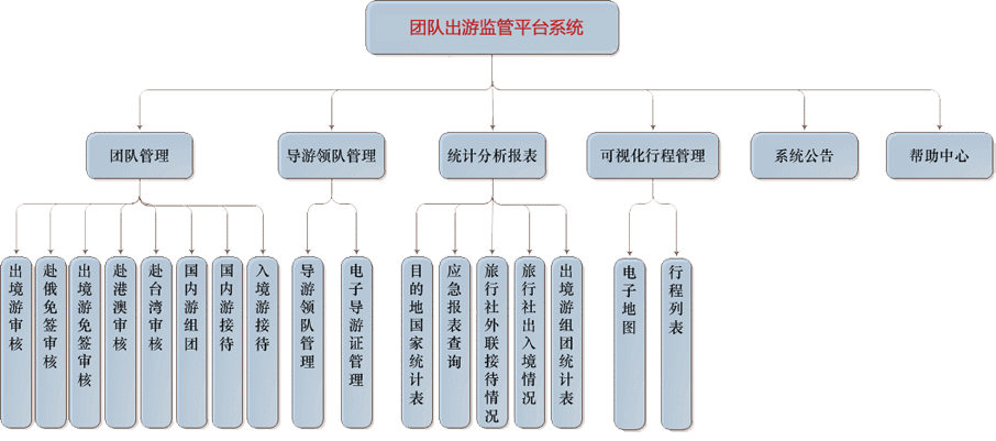 根據(jù)團隊出游業(yè)務(wù)需求及出境旅游行業(yè)特點,出境旅游團隊監(jiān)測與分析功能包括團隊管理、導(dǎo)游/領(lǐng)隊管理、統(tǒng)計分析報表、可視化行程管理和系統(tǒng)公告、幫助中心六大部分。