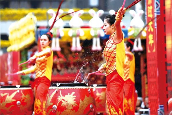 △ 2018年3月2日,幾位靚麗的女孩子在廣場上表演擊鼓。當日是中國傳統(tǒng)節(jié)日元宵節(jié),數(shù)萬民眾來到西安大唐西市,熱鬧逛廟會、欣賞民俗表演。張遠攝