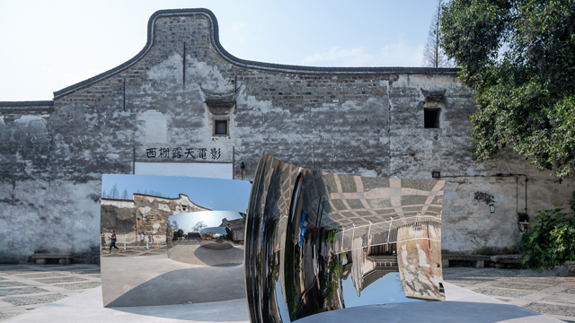 《雙眩》是西柵展品中“流量”最多的展品,每天吸引著游客駐足拍照。兩面不銹鋼曲面的鏡像,容納江南水鄉斑駁墻面和如織游人,倒置、正向的鏡面,反射出的虛像向無限深處展開。