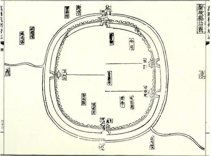 據《新登縣志》記載:“明嘉靖三十四年修筑城墻三里共六百余丈,高一丈六尺,只開四門,修雉堞五百七十堵。”“明萬歷三年知縣溫朝祚增作女墻,高三尺五寸,池環如城。”