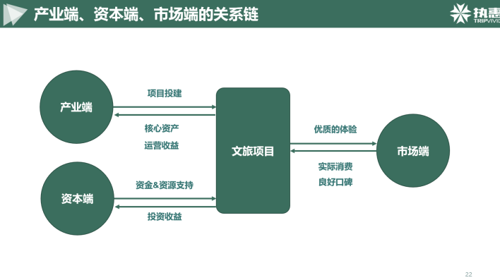 我們總結了產業端、資本端、市場端三個維度的情況,我們可以梳理出他們之間的一條關系鏈。產業端的前期投建依托于資本端的支持與助力,通過文旅項目給市場端帶來的優質的體驗,從而形成實際消費及良好的口碑,獲得最終的投資收益。對于產業端來說,這是一張項目發展結構圖,對于資本端來說,這是一張現金流向圖。