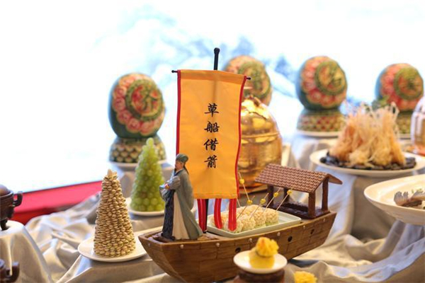 在文化創意主題宴席比賽環節,各酒店更是“使勁渾身解數”“拿出看家本事”。在銀座泉城大酒店宴席,一個外形雕刻精致細膩的空心西瓜中,一只雞靜靜地臥于其中。甫一上桌,這道泉水西瓜雞就賺足評委們的眼球。山東東方大廈創新性打造的“東方琉璃喜宴”,也給評委們留下深刻印象。索菲特銀座大飯店的齊魯文化名宴,以齊魯十二名人故事為背景,打造出“草船借箭”“孟母三遷”“藕花深處”等形神皆備的菜品,再配上獨具特色的敬茶禮,中國傳統文化、儒家文化于無聲處滲透到每位賓客心中。舜耕山莊的上合孔府家宴、山東禧悅東方大酒店的東方魯韻宴、中豪大酒店的雨荷素食宴、銀座泉城大酒店的泉水主題宴等也頗具特色。
