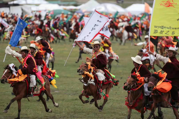 萬馬齊奔騰,群眾載歌舞。7月30日下午,理塘賽馬節在小毛埡草原“八一賽馬場”開幕。開幕式上,非遺藏戲、百人彈唱、千人鍋莊等濃郁藏區特色的文藝匯演為草原英雄“熱身”。四川省文聯黨委書記、常務副主席平志英授予理塘縣“四川賽馬文化之鄉”牌匾,中共理塘縣委書記格勒多吉致開幕辭。