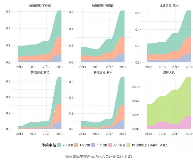 從休閑空間來(lái)看,城鄉(xiāng)居民休閑半徑不斷擴(kuò)大,中短途距離休閑占比大幅提高。2019年我國(guó)城鎮(zhèn)居民工作日、周末和節(jié)假日期間休閑半徑在2-7公里以內(nèi)的比重分別為61.2%、63.1%和62.1%,農(nóng)村居民農(nóng)閑時(shí)離家2-3公里以內(nèi)休閑占比為35.8%,越來(lái)越多的城鄉(xiāng)居民在休閑時(shí)間走出家門(mén),享受更為豐富多彩的戶外休閑活動(dòng)。2019年退休居民離家8公里以上休閑比重為9.2%,旅游和郊野游憩成為越來(lái)越多退休居民的重要休閑方式。