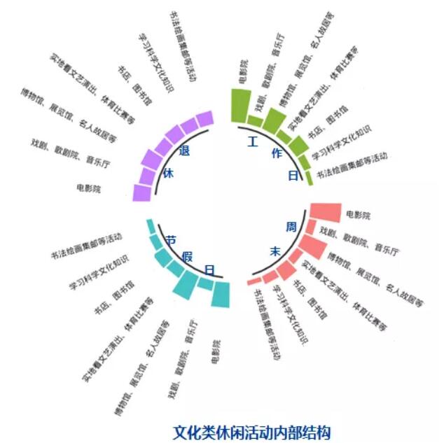 從休閑消費(fèi)選擇來(lái)看,休閑活動(dòng)多元化趨勢(shì)明顯。其中,消費(fèi)購(gòu)物類(lèi)休閑活動(dòng)是國(guó)民日常休閑的基礎(chǔ)選擇。數(shù)據(jù)顯示,城鄉(xiāng)居民消費(fèi)購(gòu)物類(lèi)休閑活動(dòng)平均占比40%左右,主要以實(shí)地購(gòu)物、外出就餐、美容美發(fā)、游樂(lè)游藝等休閑娛樂(lè)活動(dòng)為主。30%左右的受訪者閑暇時(shí)間會(huì)選擇旅游,且隨著閑暇時(shí)間的增多,異地旅游占比有所提升,如城鎮(zhèn)居民周末及節(jié)假日異地旅游比重分別為5.1%和8.0%,旅游已成為城鄉(xiāng)居民閑暇時(shí)間的重要選擇。文化類(lèi)和體育健身類(lèi)休閑是城鎮(zhèn)居民和退休人員休閑活動(dòng)的有機(jī)構(gòu)成,二者比重之和均達(dá)20%左右,其中,文化類(lèi)休閑活動(dòng)主要以看電影,參觀博物館、展覽館、科技館、藝術(shù)館、名人故居以及去書(shū)店、圖書(shū)館等休閑活動(dòng)為主。