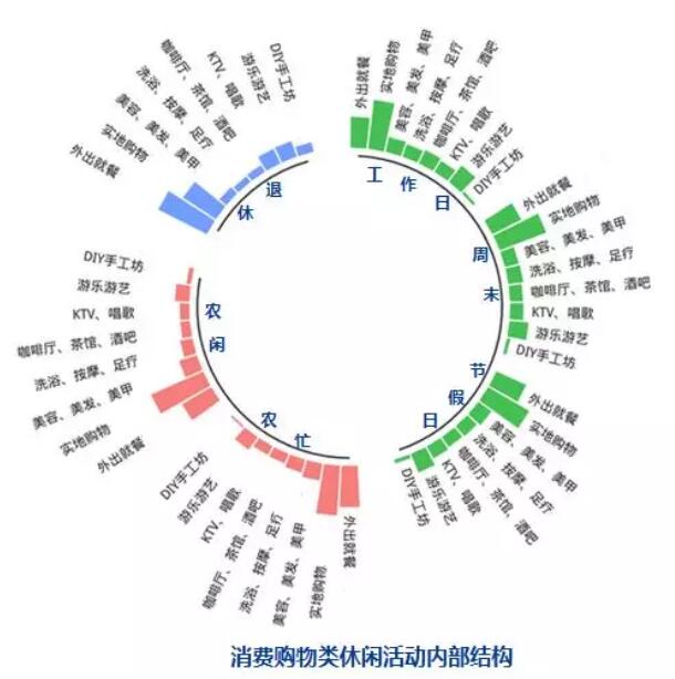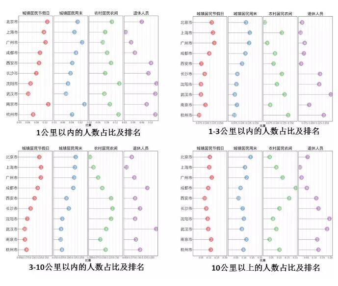從國(guó)民休閑行為的區(qū)域差異來(lái)看,在調(diào)研的10個(gè)城市中,北京、上海、廣州、成都4市城鎮(zhèn)居民在周末、節(jié)假日更喜歡外出休閑,其選擇在離家3-10公里范圍內(nèi)進(jìn)行休閑的人數(shù)占比具有絕對(duì)優(yōu)勢(shì);長(zhǎng)沙、西安、沈陽(yáng)、武漢4市的農(nóng)村居民在農(nóng)閑時(shí)喜歡到離家3-10公里范圍內(nèi)進(jìn)行休閑;沈陽(yáng)、武漢、長(zhǎng)沙、杭州4市退休居民則喜歡遠(yuǎn)距離休閑。從休閑內(nèi)容來(lái)看,北京、上海、廣州、成都4市城鎮(zhèn)居民在周末、節(jié)假日喜歡旅游、消費(fèi)購(gòu)物和參與文化類(lèi)休閑活動(dòng),其中,選擇消費(fèi)購(gòu)物的人數(shù)占比在10個(gè)城市中具有絕對(duì)優(yōu)勢(shì);武漢、長(zhǎng)沙、廣州、西安4市農(nóng)村居民農(nóng)閑時(shí)喜歡文化類(lèi)休閑活動(dòng),而沈陽(yáng)、杭州等市農(nóng)村居民農(nóng)閑時(shí)更喜歡消費(fèi)購(gòu)物;武漢、沈陽(yáng)、杭州等市退休人員更喜歡旅游和體育健身。