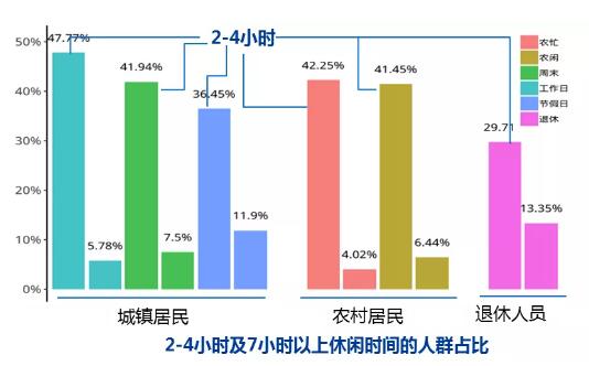 從休閑時(shí)間來(lái)看,城鄉(xiāng)居民休閑時(shí)間隨可支配時(shí)間變化而波動(dòng),工作日和農(nóng)忙期間城鄉(xiāng)居民勞動(dòng)強(qiáng)度大,可支配時(shí)間少,休閑時(shí)間相對(duì)較短;城鄉(xiāng)居民每日休閑時(shí)間平均以2-4小時(shí)為主。數(shù)據(jù)顯示,33.6%的受訪城鎮(zhèn)居民工作日工作時(shí)間達(dá)9小時(shí)以上;有40%的城鄉(xiāng)居民在工作日、周末、農(nóng)忙、農(nóng)閑時(shí)每日休閑時(shí)間為2-4小時(shí),而休閑時(shí)間7小時(shí)以上的城鄉(xiāng)居民占比隨可支配時(shí)間增多而依次提升;退休無(wú)業(yè)人員由于不受時(shí)間限制,休閑時(shí)間7小時(shí)以上的受訪者占比最高,為13.4%。