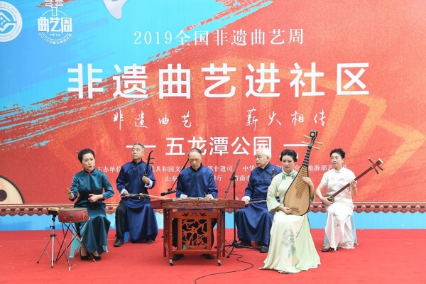 9月6日下午,2019全國非遺曲藝周第一輪進社區演出在濟南著名景區五龍潭公園內的舞臺上正式開始。一架揚琴、一把琵琶和中阮、兩把二胡,加上5個清音鼓,10余位南昌清音演員用優雅的曲調和清脆的鼓聲向市民游客展示著《今日猶聞翰墨香》。極具南昌地域特色的優雅唱腔以及表演角色將聽眾帶回當年王勃即興提寫《滕王閣序》時的情景。非遺傳承人還為現場觀眾表演了興寧竹板歌《軍長買雞》、壯族八音坐唱《妯娌共話好愿景》、四川揚琴《拷紅》、桂林漁鼓《藍絲帶》。