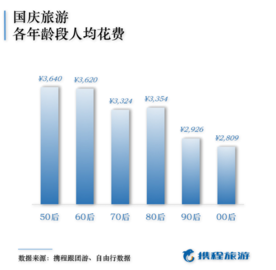 什么年齡段的中國人更偏愛在國慶出行?根據攜程跟團游和自由行訂單數據,80后和90后已經成為國慶出游的絕對主力人群,占出行總人數的51%。而報告顯示,在各年齡段的花費上,50后成為最舍得花錢的人群,單次旅游人均花費達到了3640元。
