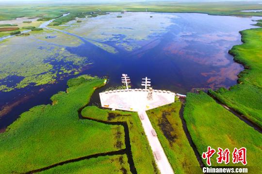凌空鳥瞰博湖縣博斯騰湖蓮海世界景區(qū)。 年磊 攝