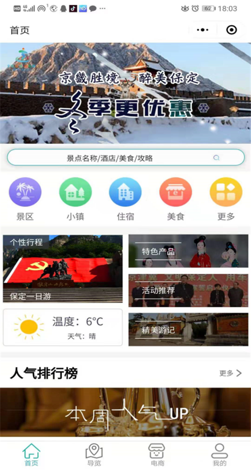保定文化和旅游資源豐富,一直都是京津冀區(qū)域重要的旅游目的地,2018年保定全市接待國(guó)內(nèi)外游客1.12億人次,旅游總收入1198億元,同比增長(zhǎng)25%。2019年國(guó)慶假期,實(shí)現(xiàn)旅游總收入80.27億元,相比去年增長(zhǎng)14%。“一機(jī)游保定”整合了保定市景區(qū)景點(diǎn)、旅游企業(yè)、旅游設(shè)施等百余類(lèi)行業(yè)信息,包括保定全域景區(qū)、酒店、購(gòu)物、餐飲等千余家涉旅商戶的基礎(chǔ)信息數(shù)據(jù)采集。游客可以通過(guò)手機(jī)進(jìn)行景點(diǎn)介紹查詢(xún)、保定特產(chǎn)查詢(xún)、旅游設(shè)施查詢(xún)、旅游門(mén)票預(yù)訂、熱門(mén)線路預(yù)定等,盡享一站式保定智慧服務(wù)。比如:查詢(xún)保定吃住行游購(gòu)?qiáng)氏嚓P(guān)信息,及時(shí)通過(guò)文字、精美圖片、高清視頻了解保定文旅資訊;通過(guò)網(wǎng)絡(luò)地圖查詢(xún)景區(qū)內(nèi)外景點(diǎn)、停車(chē)場(chǎng)、洗手間等位置信息,并享用導(dǎo)航導(dǎo)覽導(dǎo)游服務(wù);游客還可以通過(guò)該小程序查詢(xún)景區(qū)天氣、聯(lián)系旅行社、享用租車(chē)、導(dǎo)游等服務(wù);在面臨特殊情況下,游客還可以通過(guò)該小程序上報(bào)特殊事件,并呼叫救援服務(wù)。