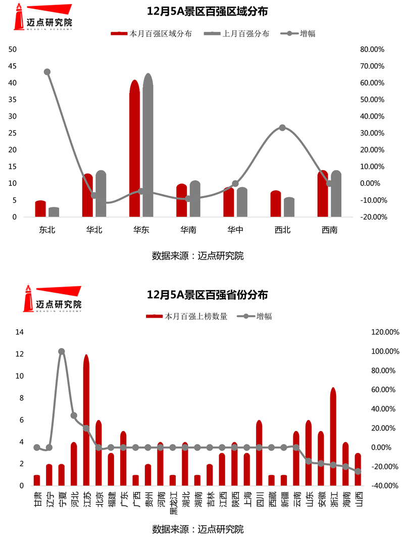 環(huán)比上月,本月華北、華東及華南地區(qū)市場(chǎng)熱度減退,但東北和西北地區(qū)上榜景區(qū)數(shù)量呈現(xiàn)出大幅上漲態(tài)勢(shì),其中東北增幅最為顯著,環(huán)比上升66.67%。相較于其他省份,本月 遼寧甘肅表現(xiàn)突出,區(qū)域內(nèi)百?gòu)?qiáng)景區(qū)從無(wú)到有,實(shí)現(xiàn)跨越式增長(zhǎng)。東北地區(qū)生態(tài)環(huán)境優(yōu)越,森林、草原、濕地、冰雪旅游資源獨(dú)具特色,在12月數(shù)據(jù)監(jiān)測(cè)中,該地區(qū)共有5家景區(qū)進(jìn)入百?gòu)?qiáng)名單,其中本溪市本溪水洞景區(qū)和大連老虎灘海洋公園作為百?gòu)?qiáng)新秀成功入圍。西北地區(qū)本月表現(xiàn)尤為亮眼,甘肅敦煌鳴沙山月牙泉景區(qū)繼8月份后再度晉級(jí)百?gòu)?qiáng)。