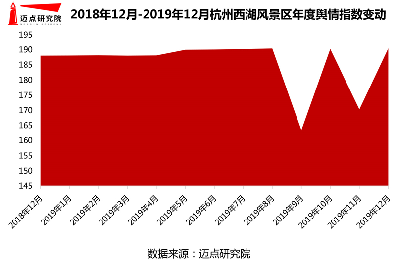 在反映實(shí)際客群關(guān)注度方面的輿情指數(shù)上,本月表現(xiàn)突出的是杭州西湖風(fēng)景區(qū)。經(jīng)邁點(diǎn)研究院數(shù)據(jù)監(jiān)測(cè),12月杭州西湖輿情指數(shù)高達(dá)190.49,環(huán)比增長(zhǎng)11.81%。從全年該景區(qū)輿情指數(shù)變動(dòng)來(lái)看,除9月及11月呈現(xiàn)小幅度下降之外,整體處于穩(wěn)步發(fā)展態(tài)勢(shì)。