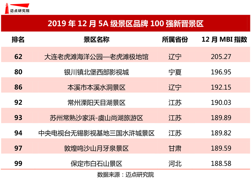 下是邁點(diǎn)研究院獨(dú)家發(fā)布的“2019年12月5A級(jí)景區(qū)品牌100強(qiáng)榜單”。月度5A級(jí)景區(qū)品牌百?gòu)?qiáng)榜單由邁點(diǎn)研究院研制,旨在通過(guò)數(shù)據(jù)解讀景區(qū)在互聯(lián)網(wǎng)及移動(dòng)互聯(lián)網(wǎng)領(lǐng)域的影響力,為景區(qū)制定戰(zhàn)略方案提升品牌發(fā)展賦能。