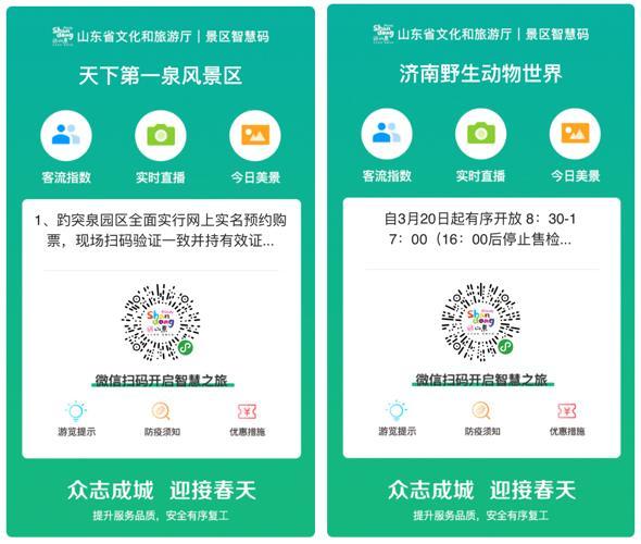 隨著疫情防控形勢的發展,山東各地景區逐步恢復開放。為在抓好疫情防控工作的同時精準助力文化旅游行業有序復工復產,近日,山東省文化和旅游廳依托好客山東網智慧文旅公共服務平臺,結合大數據、云計算等科技手段,推出集疫情防控、景區服務、線上營銷三方面功能于一體的“景區智慧碼”。“景區智慧碼”在好客山東網微信小程序的基礎上,整合線上線下信息,通過“一園一碼”的方式,在山東各景區陸續上線,為文旅產業復工復產提供科技支撐。