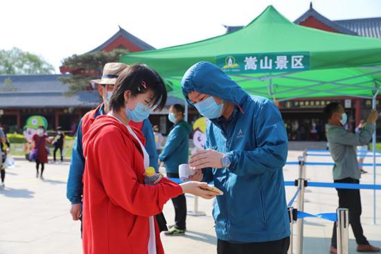 嵩山景區時刻將游客的生命安全放在第一位,科學防控疫情。每天對游客中心、觀光車、休息區等旅游接待場所以及基礎設施實行一日三次的環境衛生消殺。按照“先掃碼量體溫再入園”的防疫要求,在景區入園及游客聚集處,設置多個游客分流通道,引導游客進行健康碼驗證,進行體溫監測與游客自助刷票入園,快速分散人流,防止游客聚集,加快了游客的進園速度。景區的觀光車施行半數滿員政策,每輛車承載游客不超過荷載人數的二分之一。增加各類安全類標識標牌1000余個,在游客中心廣場、入口、景點、觀光車乘車點等重點區域增派工作人員,時刻提醒游客做好個人防護,遵守景區防護措施,確保游客安全游覽。