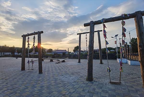 漸漸駛離延吉西站,窗外的稻田郁郁蔥蔥,一叢叢青磚黛瓦的朝鮮族民居鑲嵌在延綿起伏的山巒之間。車子離開公路,駛入一條蜿蜒曲折的鄉路,路旁的住房多了起來,裊裊炊煙也開始生動具體,我們慢慢進入了龍井市。