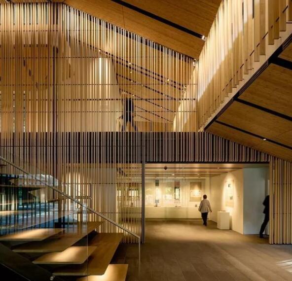 建筑層高低矮,主要材料是鋼和玻璃,立面和內(nèi)部裝飾大部分采用當(dāng)?shù)啬静模c環(huán)境完美協(xié)調(diào)。室內(nèi)景觀,隈研吾也以自己一貫的風(fēng)格做了設(shè)計(jì):若有似無(wú)的空間隔斷、視野開(kāi)闊的大面落地窗、簡(jiǎn)潔但充滿細(xì)節(jié)的空間布局。
