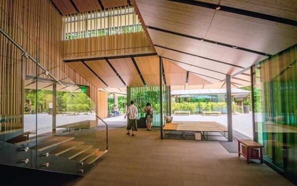 文化村于2017年4月2日正式對(duì)外開(kāi)放,作為一處擴(kuò)建工程,其位于花園大門外面并通往花園。隈研吾利用山林間和室內(nèi)空間的高低落差,做了循序漸進(jìn)的引導(dǎo)設(shè)計(jì)。參觀者可以舒服有序地進(jìn)入園林,不會(huì)在偌大的空間里暈頭轉(zhuǎn)向。