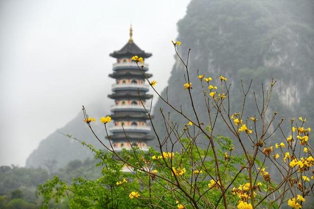 岜公塘濕地公園春風(fēng)徐徐,清澈的湖水和周邊的樹林相映成趣,時(shí)有飛鳥擦過湖面,飛至湖心綠島。蒙蒙細(xì)雨中,盛開的黃花風(fēng)鈴與遠(yuǎn)處的景觀塔相得益彰。湖面倒映的景觀塔,與旁邊的孤山一起為濕地添上幾分詩意。