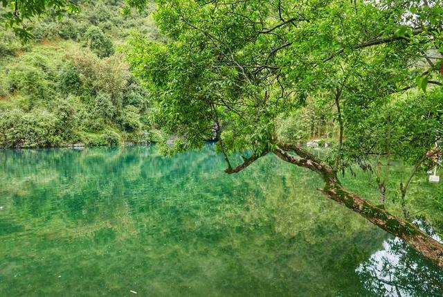 采風(fēng)團(tuán)一行冒雨驅(qū)車來到了青山疊嶂的土博鎮(zhèn)琴懷村,去尋找被稱為“柳版九寨溝”的狼口泉。狼口泉,潭水碧綠,青山環(huán)繞,據(jù)說潭底通地下河,水深逾70米。碧綠的小河從納社屯旁靜靜流過,明河流經(jīng)村野,水靜流深,村民的扁舟劃波而過,便是一張鄉(xiāng)村游樂圖。暗河穿越巖洞,回歸野性,水鴨在淺水上隨心覓食,及膝的河水越過石灘,沖下飛瀑。鐘乳石洞神秘而誘人,陽光從洞頂?shù)目p隙中透入,更增添了一絲仙氣。