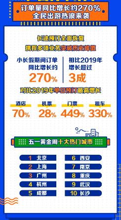 今年五一連休五天,消費者積蓄已久的長途出行需求得以釋放。來自攜程方面數(shù)據(jù)顯示,攜程五一假期總訂單量同比增長約270%,對比2019年同期增幅超過30%。酒店、門票、租車、機票四項業(yè)務(wù)單日訂單量最高增幅分別為:70%、449%、330%、28%。