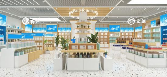 “長白山禮物”首家旗艦店坐落于長白山保護開發區的美人松空中廊橋公園,將現代時尚元素和長白山特色文化融會貫通,天池藍與粉雪白構成長白山禮物的形象顏色。