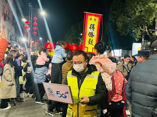 2月1日,“中國狀元縣”——休寧縣隆重開展“鼓迎新春龍騰狀元城”傳統(tǒng)民俗表演活動,華燈璀璨、張燈結(jié)彩、人頭攢動、熱鬧非凡,游客和村民前來感受非遺傳統(tǒng)文化。為保障活動期間通信暢通,安徽移動休寧分公司組織志愿服務(wù)小分隊,對狀元古城實現(xiàn)5G全覆蓋,提前對狀元街、狀元博物館等活動周邊區(qū)域進行多輪測試和設(shè)備巡檢,對4G/5G網(wǎng)絡(luò)進行擴容,進行現(xiàn)場網(wǎng)絡(luò)保障。