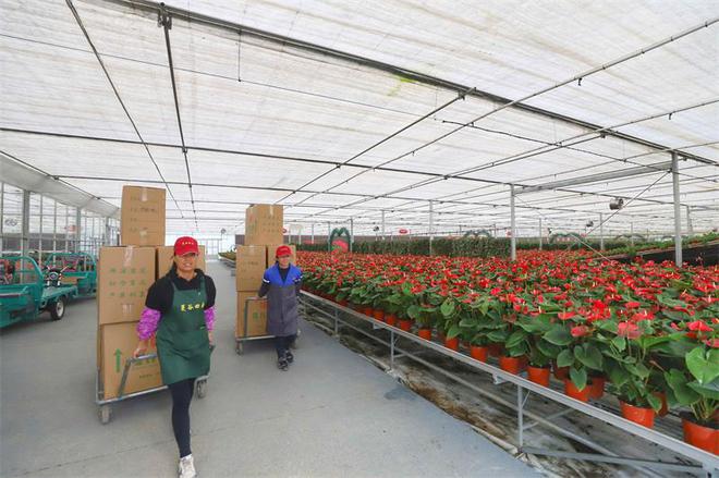 彭澤縣蔓谷田園綜合體大棚內各式花卉擺放整齊,工人正在打理。