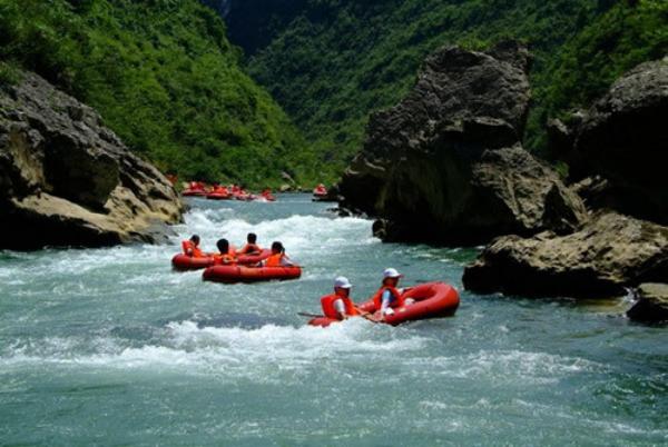 毗鄰的務(wù)川自治縣豐樂(lè)鎮(zhèn),洪渡河漂流的熱度隨著氣溫的升高,呈現(xiàn)火熱態(tài)勢(shì),一艘艘皮劃艇順流而下,游客們的歡呼聲和尖叫聲此起彼伏。