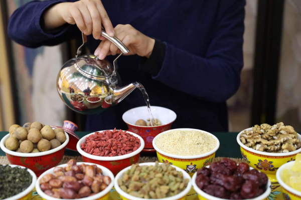 在早茶店不遠處,是一家名為“劉三朵”的八寶茶店。將玫瑰、芝麻、枸杞等八種食材按個人喜好抓到蓋碗里,再倒上沸水沖泡,燜一會兒,就是一碗香甜可口的八寶茶。茶喝到剩1/3時,再繼續(xù)加水慢品,直到茶湯變淡,過程頗為考究。吳忠八寶茶過去多次在國際性的博覽會上展出,受到不少外國友人的歡迎。