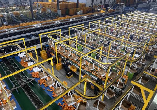 智能分選設備和成箱柑橘占據了廠房大部分空間,一列列橘色“小球”在數百米傳送帶上有序滾動、跳躍,最終被分流至精包線,由工人進行核檢包裝。這里是湖南省規模最大的果品智能化加工基地,每月可加工處理橘橙約1.2萬噸。