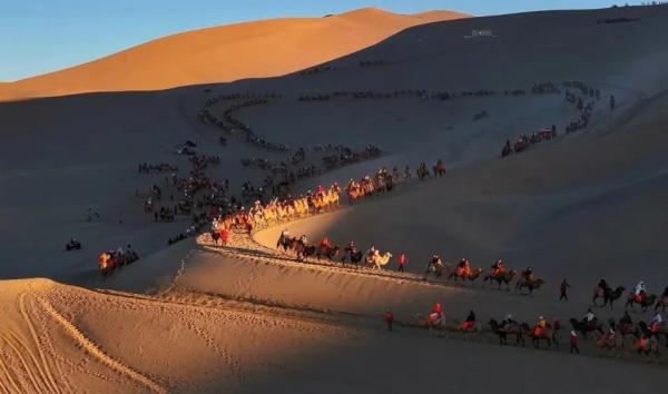 在下方,又一批游客正仰望著天空,等待實現(xiàn)千年飛天夢。金色沙海中,現(xiàn)代飛行器的投影與駝隊的身影交疊在一起,敦煌用科技與文化的融合,續(xù)寫著絲綢之路的新傳奇。