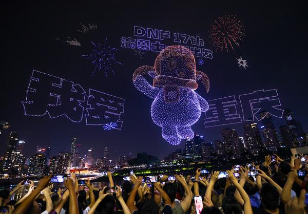 國際籃球巨星斯蒂芬·庫里親臨“新韻重慶”現(xiàn)場觀禮無人機(jī)光影秀,與全球玩家共賞“無畏契約×重慶朝天門”主題表演。千架無人機(jī)在長江與嘉陵江交匯處騰空而起,以山城地形為畫布,勾勒出《無畏契約》的“皮蛋”造型,向庫里和全體觀眾大秀空中投籃與晚安禮。