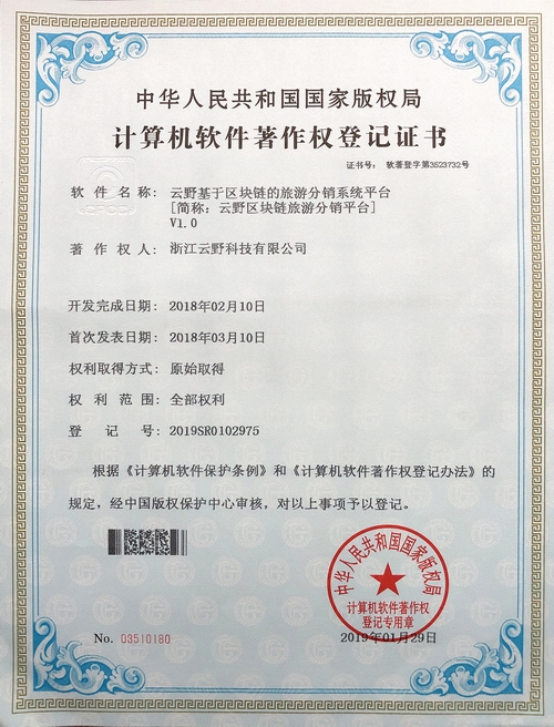 《云野基于區塊鏈的旅游分銷系統平臺V1.0》于2019年1月29日被正式授予《中華人民共和國國家版權局計算機軟件著作權登記證書》,登記號為2019SR102975。