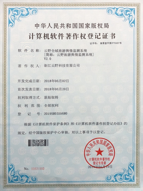 《云野全域旅游輿情監測系統V2.0》于2019年4月19日被正式授予《中華人民共和國國家版權局計算機軟件著作權登記證書》,登記號為2019SR0355680。